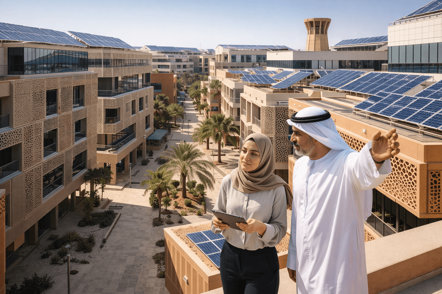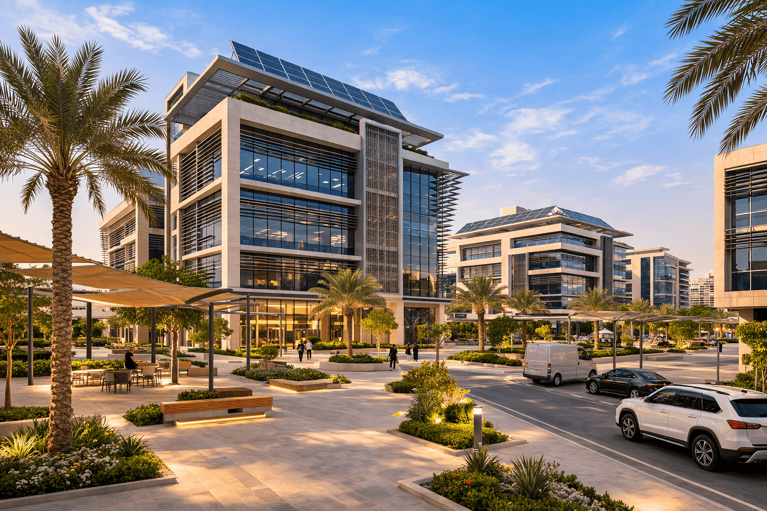 These principles are particularly visible in sustainability-driven districts such as Masdar City Free Zone, where urban planning and architecture are designed around environmental performance.